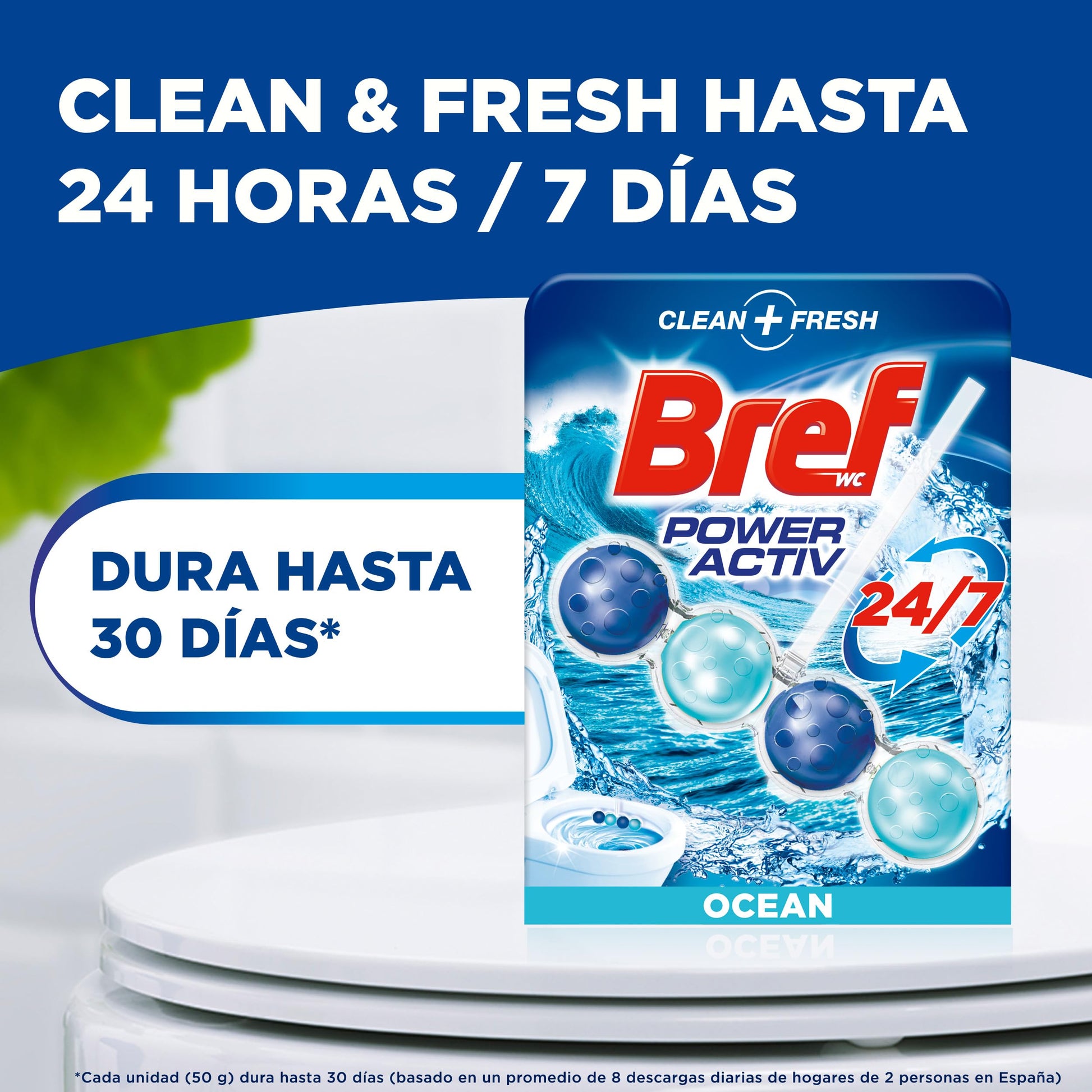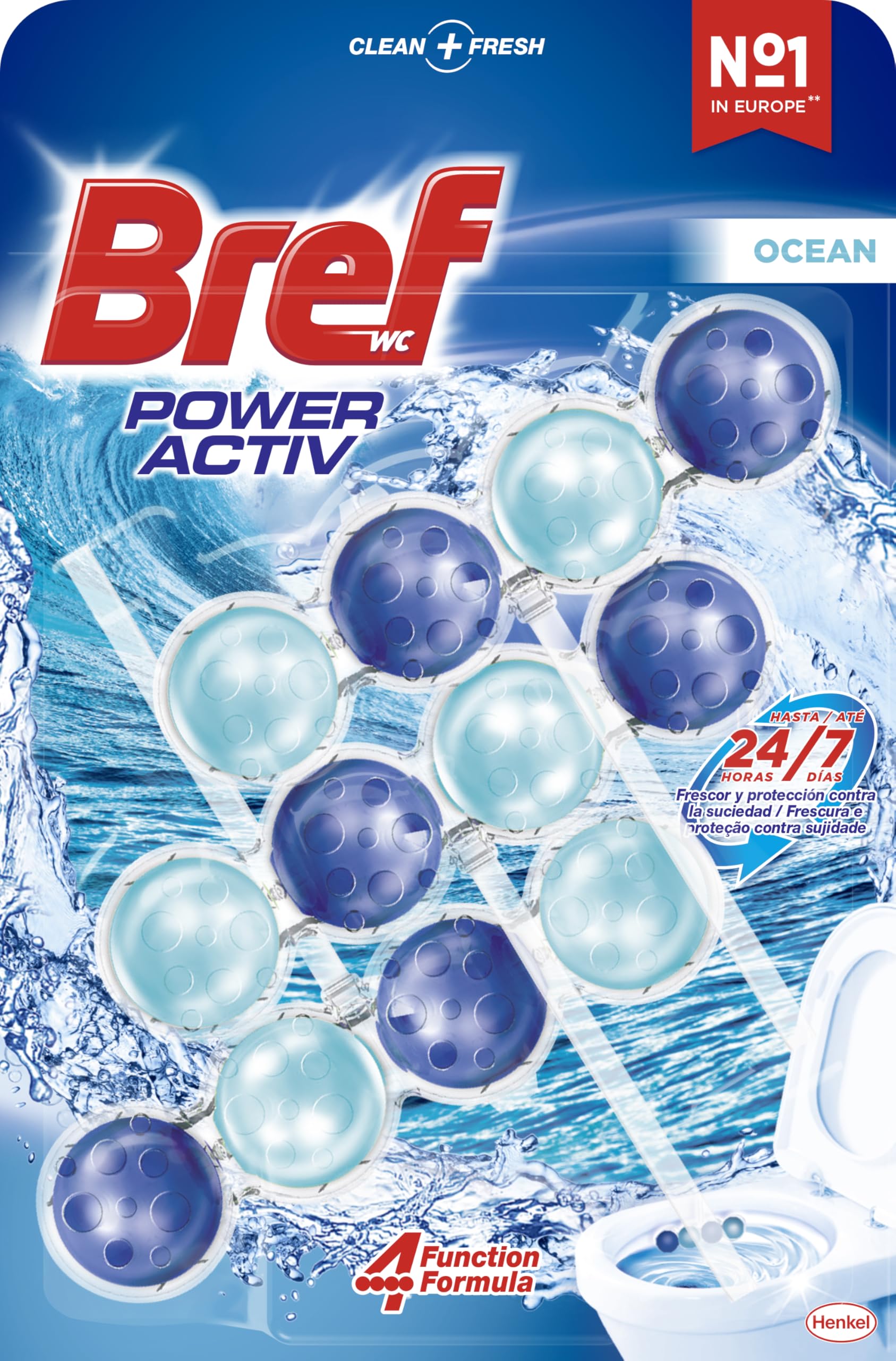 - Confezione – Bref Power Activ Ocean Detersivo WC, profumazione oceano, prodotto per WC anti-calcare, pulizia a ogni risciacquo, formato da 1 confezione da 3 x 50g