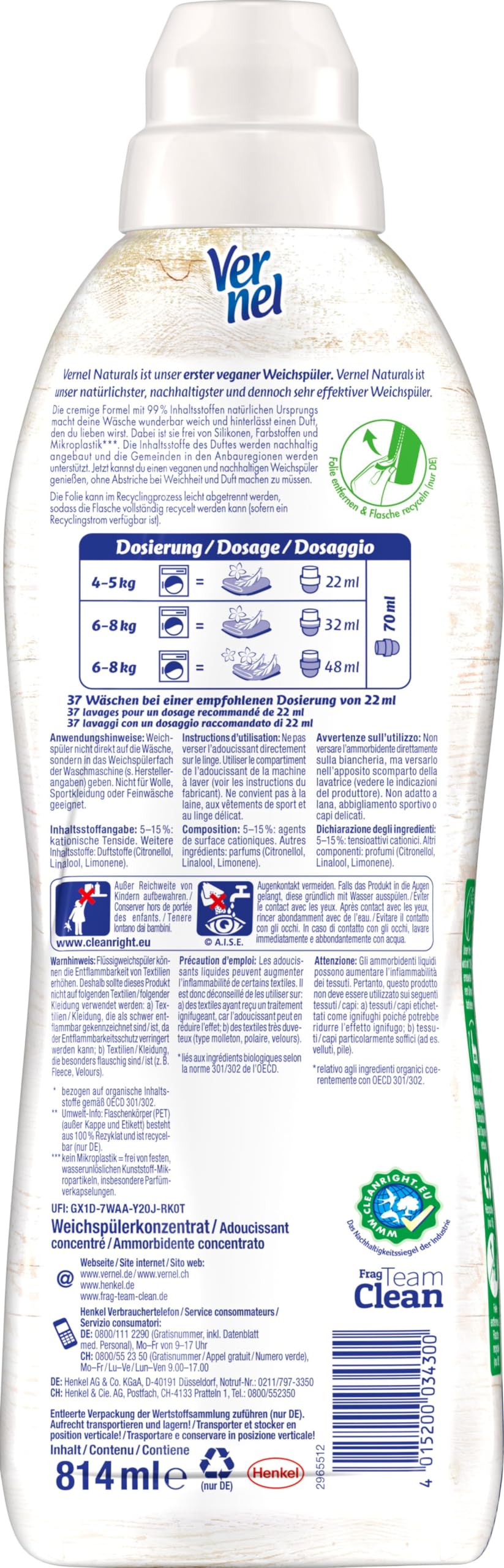 - Vegan: Vernel Naturals è un ammorbidente vegano con il 99% di ingredienti naturali, senza siliconi e coloranti. I semi di colza coltivati in modo sostenibile servono come base per l'ammorbidente vegano